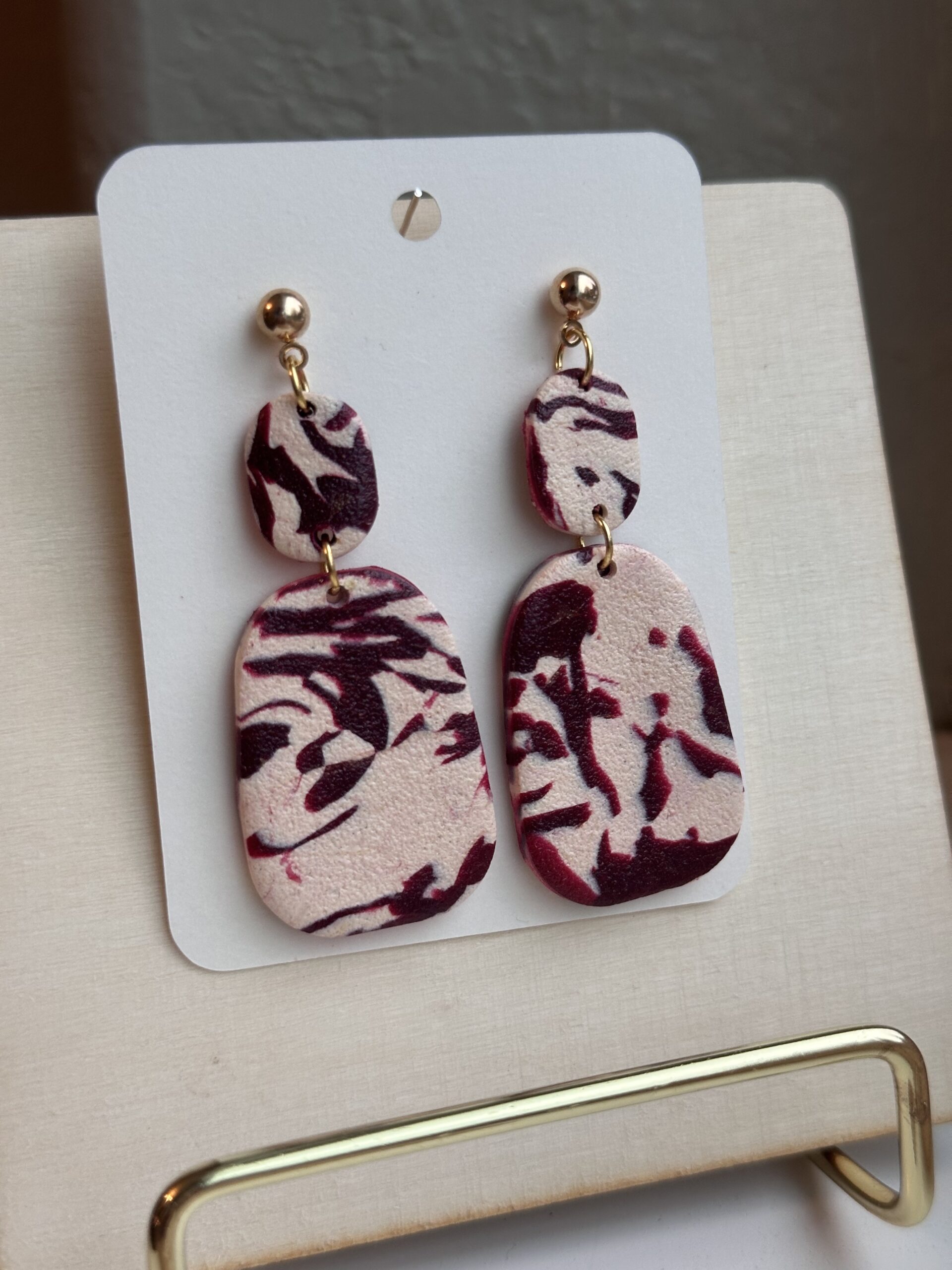 Double oval dangle with gold accents and a swirl of cranberry red and cream!