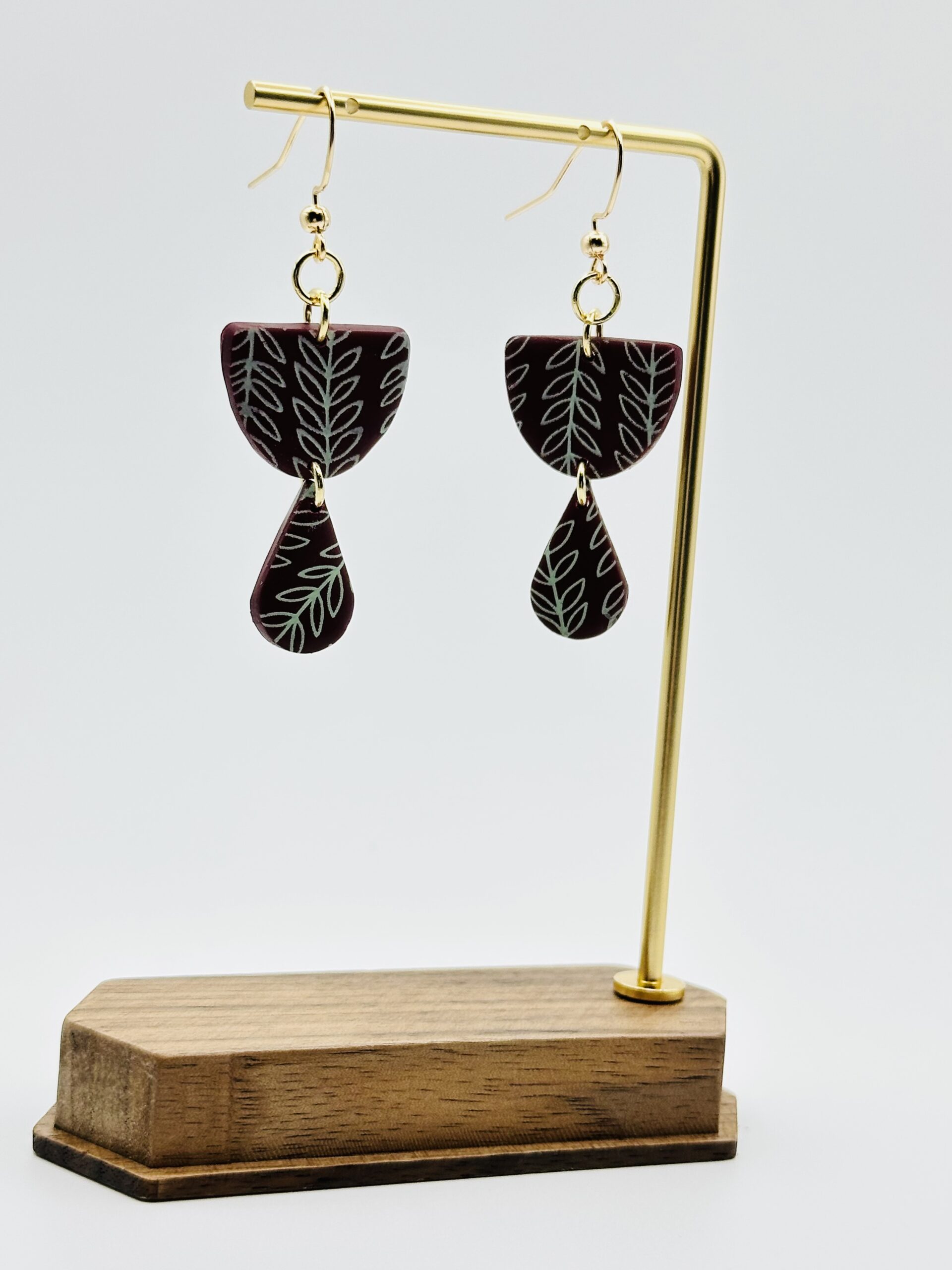 Delicate teardrop in maroon with a sage green print. Gold accents.
